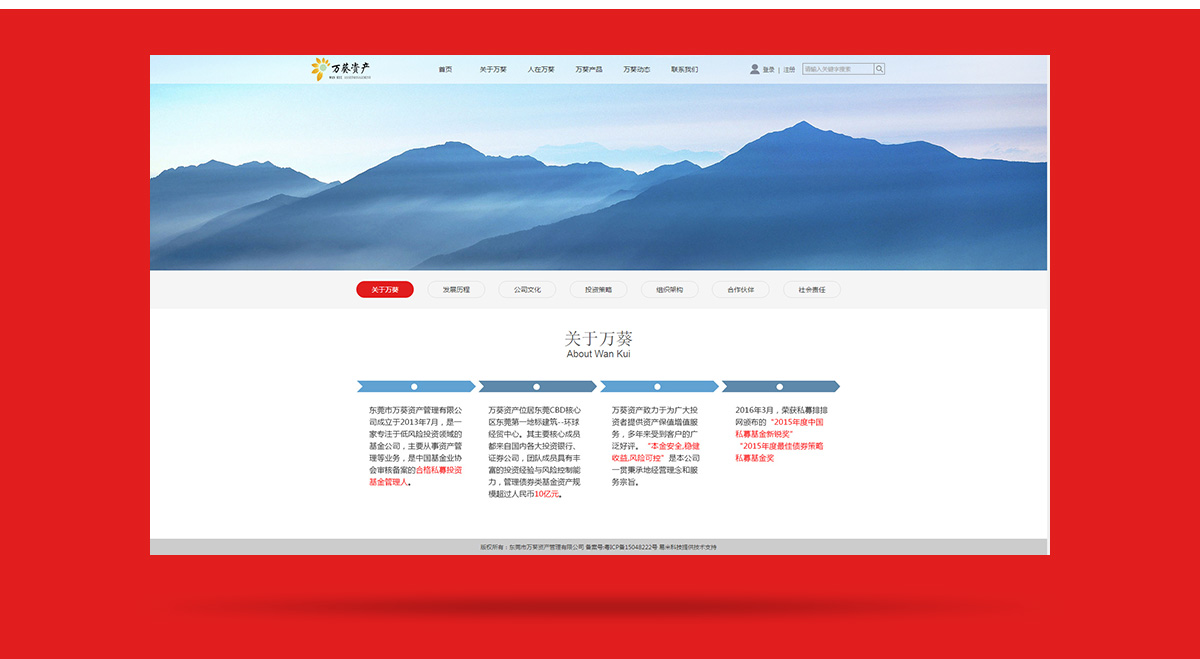 东莞市万葵资产管理有限公司成立于2013年7月,是一家专注于低风险投资领域的基金公司,主要从事资产管理等业务,是中国基金业协会审核备案的合格私募投资基金管理人员。